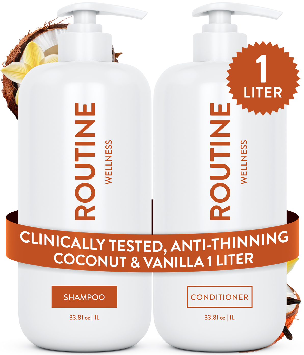 Routine Wellness Shampoo & Conditioner are packed full of DHT blocking ingredients specifically formulated for thinning hair, like Saw Palmetto and Biotin.