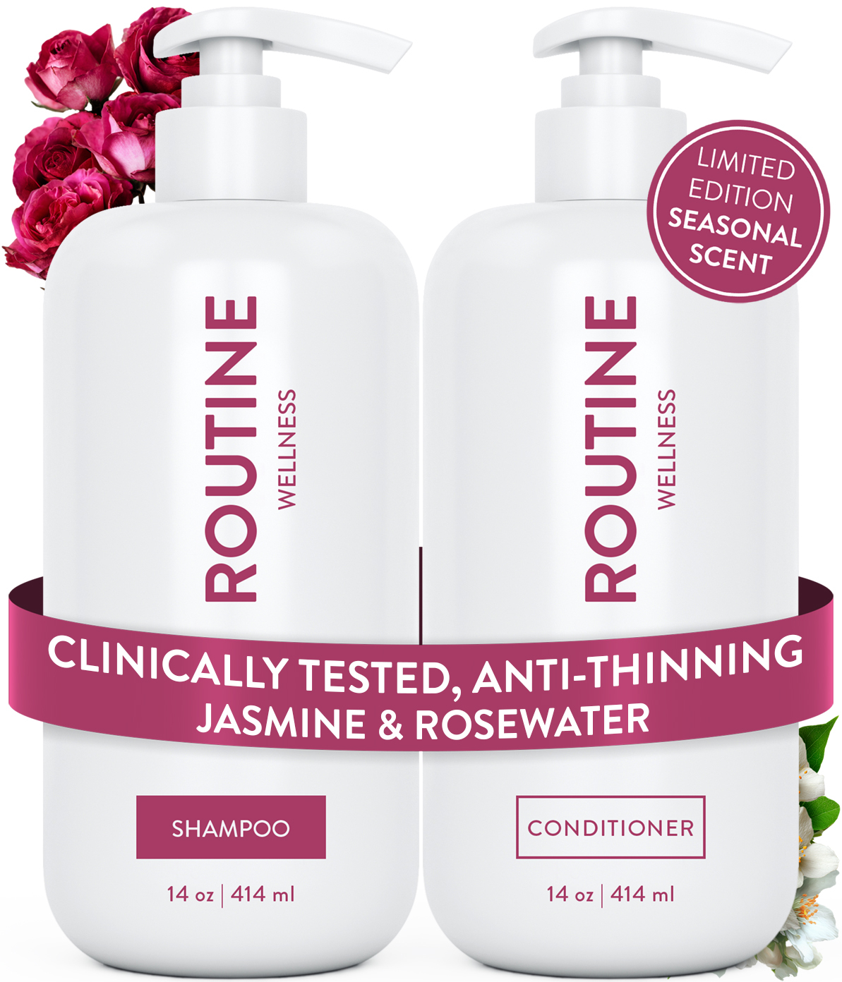 Great shampoo & conditioner!I've been using the shampoo and conditioner (and also the vitamins) for about two months now. My hair was seriously thinning in spots and I thought I'd give it a shot. I think these are great products...very little to no hair in the shower drain, and my thin spots are filling back in. The scents are delightful and my hair feels nice, has volume and looks healthy. I'll probably continue using these lovely products even after my hair is back to normal. Nice job, Routine!