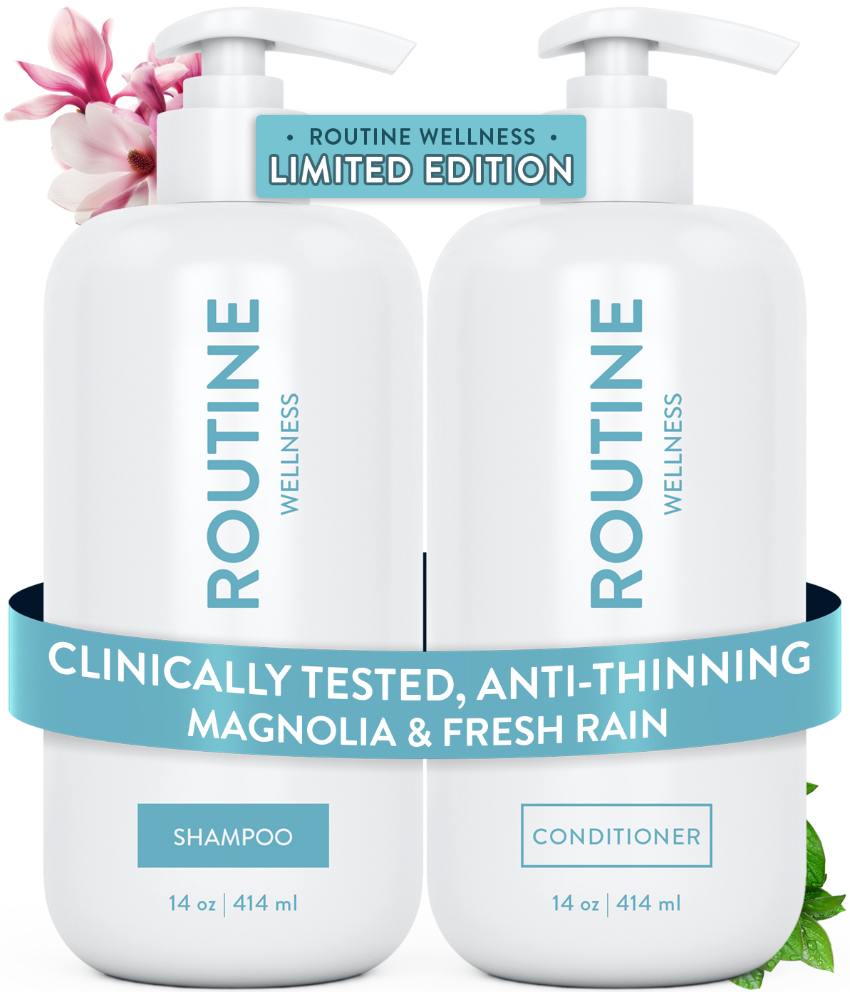 Routine Wellness Shampoo & Conditioner are packed full of DHT blocking ingredients specifically formulated for thinning hair, like Saw Palmetto and Biotin.