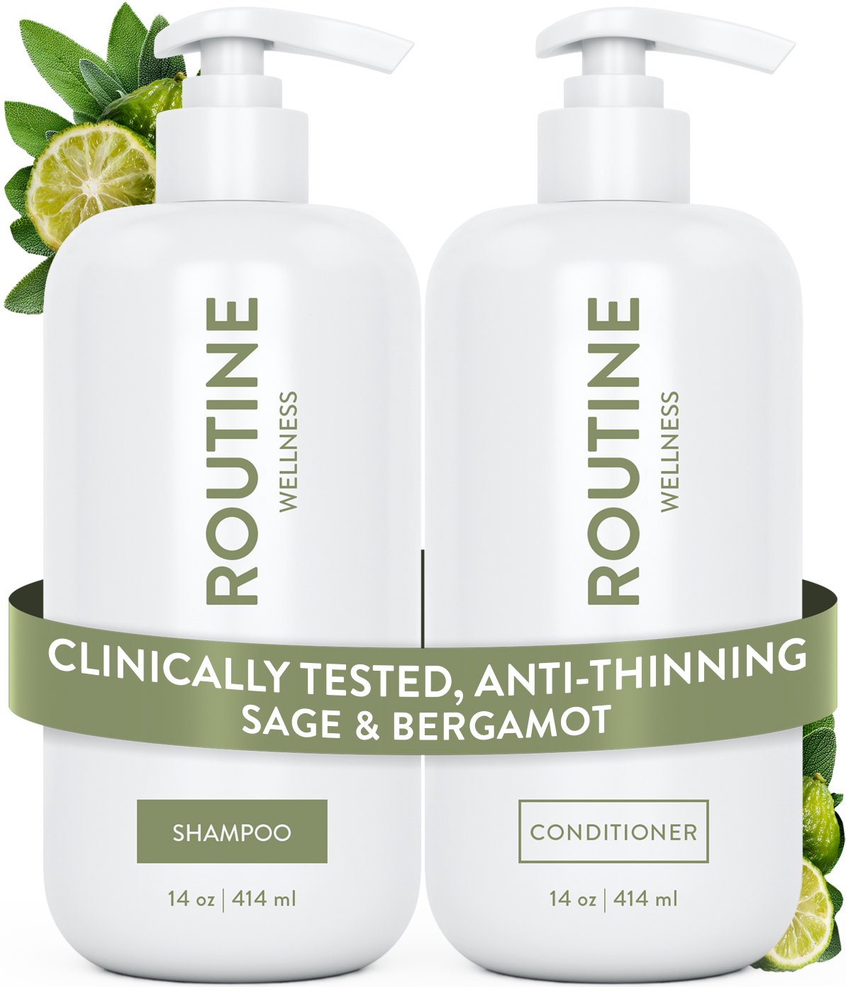 Routine Wellness Shampoo & Conditioner are packed full of DHT blocking ingredients specifically formulated for thinning hair, like Saw Palmetto and Biotin.